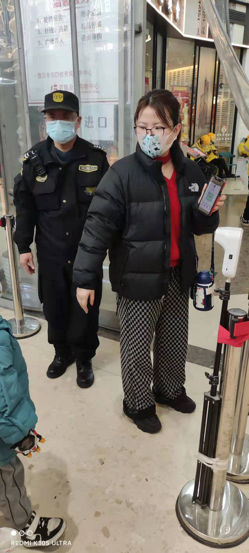 在商場各個進出口處,有專門的工作人員測溫并提醒出示健康碼、佩戴口罩等防控措施。顧客積極配合,工作人員認真負責,讓這一系列防疫流程得以流暢而順利的進行。