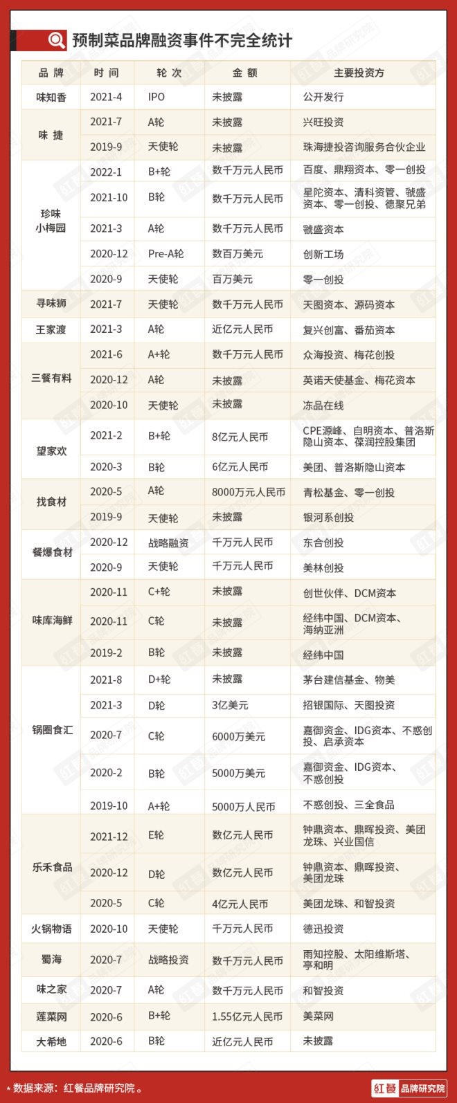 隨之而來的便是創(chuàng)業(yè)公司相繼獲得融資。王家渡食品、三餐有料、尋味獅等預制菜企業(yè)接連獲得融資,金額基本都在千萬元以上,多則在近億元;珍味小梅園更是在半年內(nèi)獲得三次融資。其中,IDG資本、源碼資本、番茄資本、美團龍珠等資本紛紛押注。
