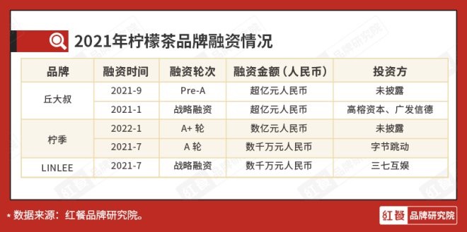 第3個階段是檸檬茶專門店越開越多,新秀品牌頻出。檸季、丘大叔等主打檸檬茶的品牌規(guī);l(fā)展——丘大叔獲得過億元Pre-A輪融資,檸季也得到字節(jié)跳動數(shù)千萬元A輪融資,讓這個品類越來越“被看見”。