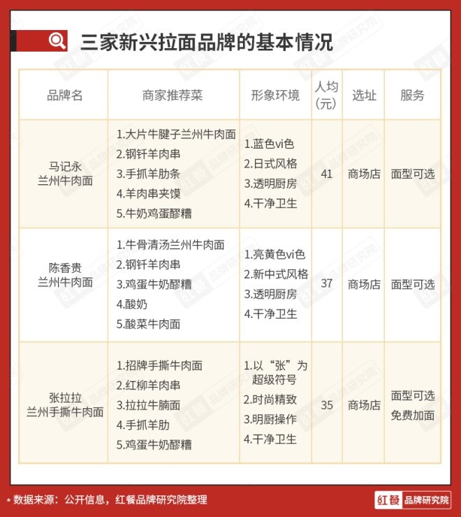 比如都強調(diào)“正宗”,張拉拉打出“五代傳承”;馬記永以蘭州拉面創(chuàng)始人馬耀山(又名馬保子)為自己品牌背書;陳香貴門店內(nèi)部則設有“地道蘭州味、飄香兩百年”品牌標語。此外,產(chǎn)品線也十分趨同。三家均有高度相似的大單品:蘭州牛肉拉面、烤羊肉串和牛奶雞蛋醪糟,價格、口味都十分接近,同時都在推出燒烤、小吃、飲品等產(chǎn)品以豐富自身產(chǎn)品線。
