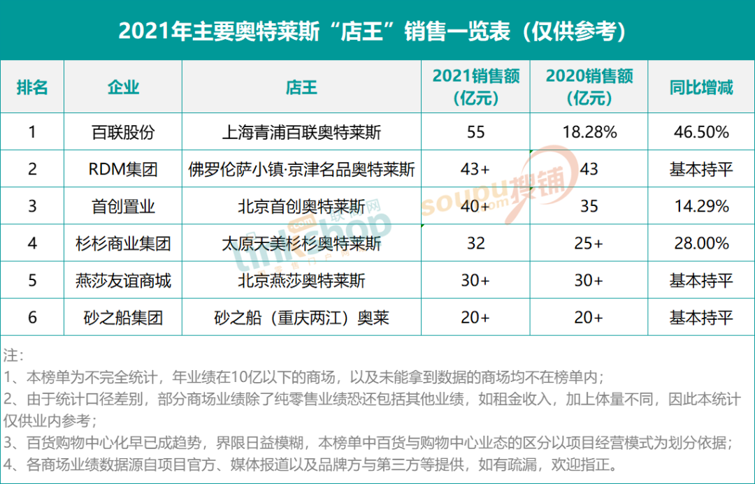 本次店王榜單中奧特萊斯商場(chǎng)僅有6家,開業(yè)15年的上海青浦百聯(lián)奧特萊斯業(yè)績(jī)最高,以55億問鼎2021年全國(guó)奧特萊斯店王榜首,同比增長(zhǎng)達(dá)到了46.5%。