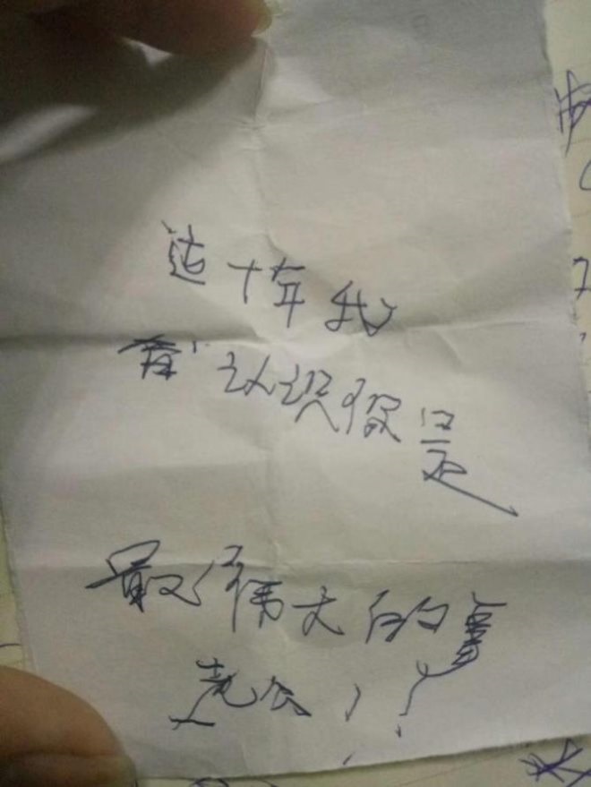 幾天時間里,楊蒙蒙在病床上除了得忍受疼痛求生,還得習(xí)慣失明后的黑暗。由于探視時間有限,他倉促問了女兒的情況和手術(shù)費用之后便與妻子惜別。隨后他盲寫了一張紙條托護(hù)士遞給妻子,上面寫著:這十年,我認(rèn)識你,是最偉大的事。