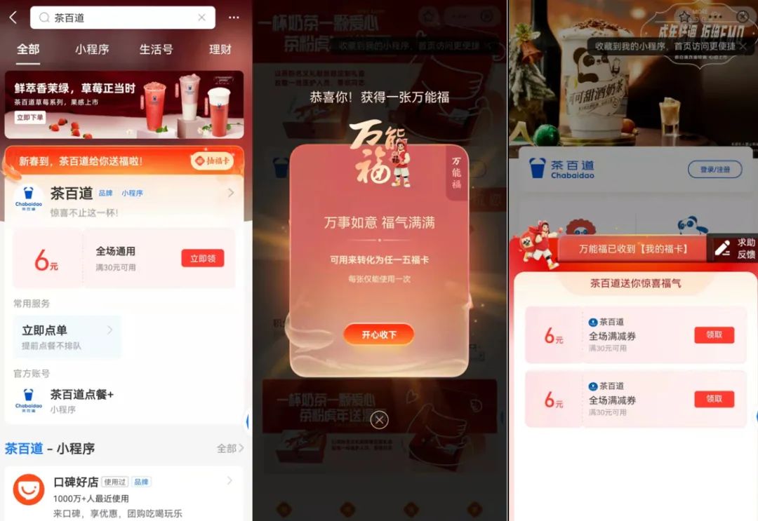 以茶百道為例,五福期間通過吸引用戶進(jìn)入私域小程序里抽?,順勢向用戶推送3元新品嘗新券,發(fā)布可可甜酒奶茶新品,用戶領(lǐng)券后可一鍵下單。茶百道小程序運(yùn)營負(fù)責(zé)人表示,“集五福已經(jīng)變成過年習(xí)慣,流量很可觀,我們就想借五福推新小程序,也更想增加茶百道品牌曝光。”