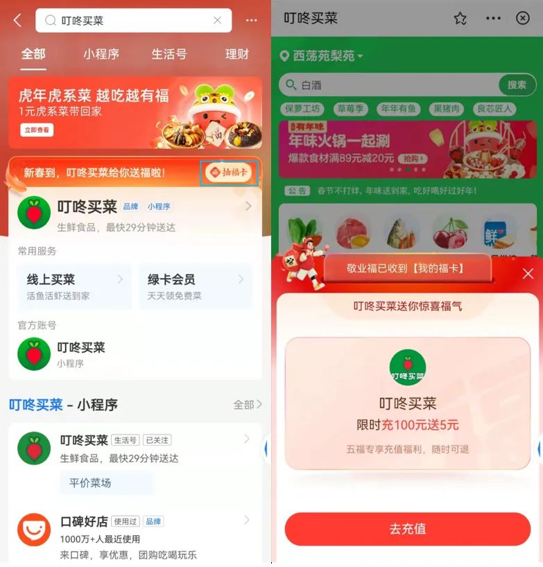 作為生鮮電商的頭部玩家之一,叮咚買菜抓住了五福的契機(jī)進(jìn)行新春線上營銷,通過“叮咚買菜”支付寶小程序派發(fā)?ㄎ脩魠⑴c,并在小程序內(nèi)上線“五福年夜飯”預(yù)制菜套餐。