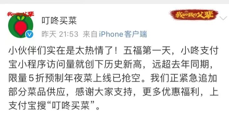 開售兩天,五福年夜飯就被搶售一空;?ǎ甯D暌癸垼苿佣_速I菜支付寶小程序創(chuàng)下一年以來的訪問峰值,也遠超去年同期。