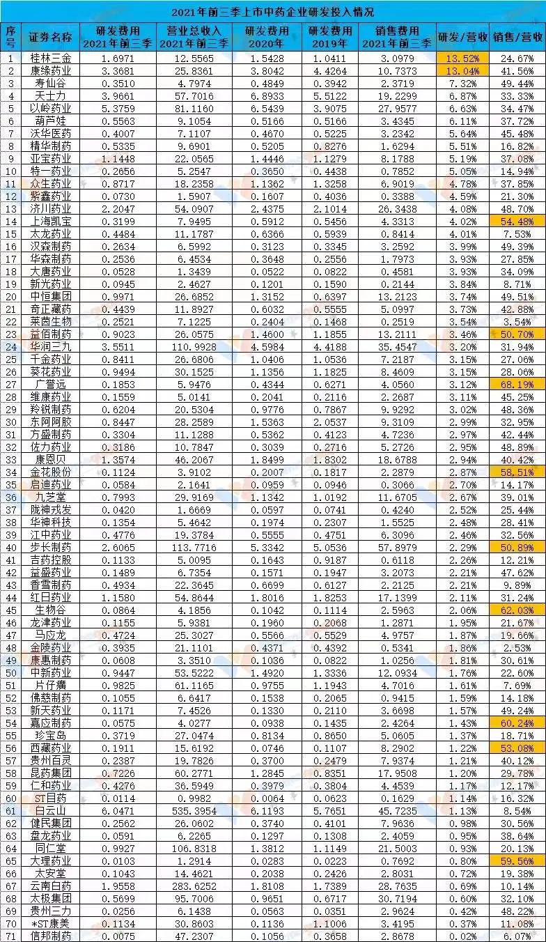 醫(yī)藥媒體“藥事縱橫”統(tǒng)計了2021年前三季度在股票市場上市的70余家國內(nèi)制藥企業(yè)研發(fā)投入占比的情況,其中白云山排到了60多位。