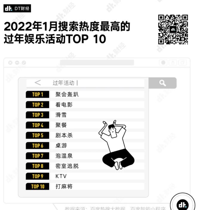 《2022虎年春節(jié)百度熱搜大數(shù)據(jù)》顯示,2022年1月,搜索熱度最高的10個過年休閑活動中,除了看電影、滑雪和泡溫泉,剩余7個都是必須團(tuán)體參與才能完成的項目。