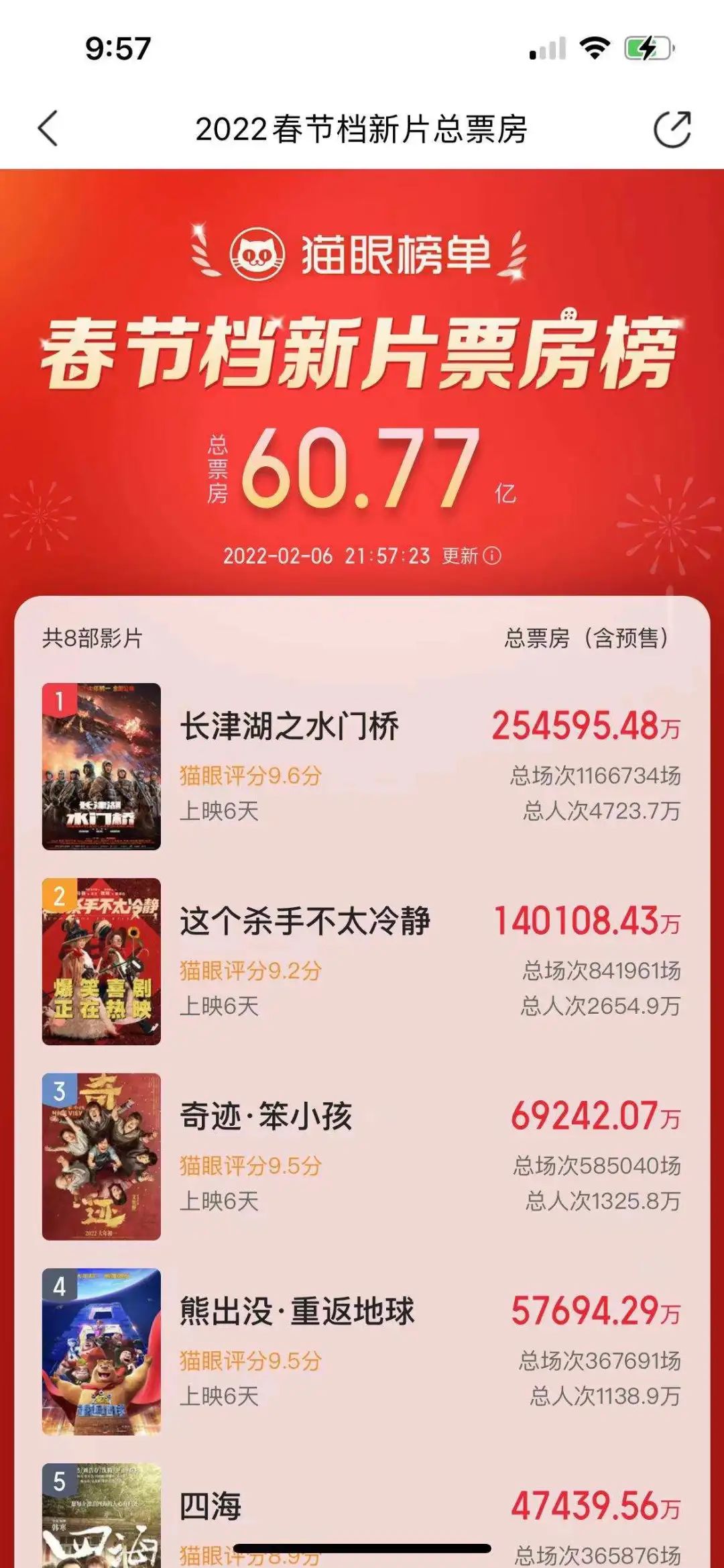 據(jù)貓眼專業(yè)版數(shù)據(jù),截至2022年2月6日21時,2022年春節(jié)檔票房超60億,去年同期為78.43億,與2019年同期票房(59.05億)基本持平。
