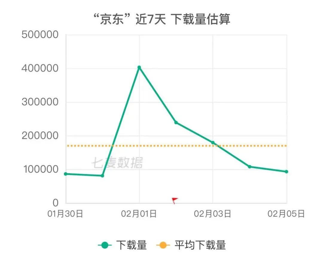 根據(jù)七麥數(shù)據(jù)統(tǒng)計(jì),2月1日,京東主App的下載量到達(dá)高峰,約40萬次,隨后逐步下跌,到2月5日,僅剩9萬次。1月30日-2月5日,7天內(nèi),京東App的下載量近120萬次。