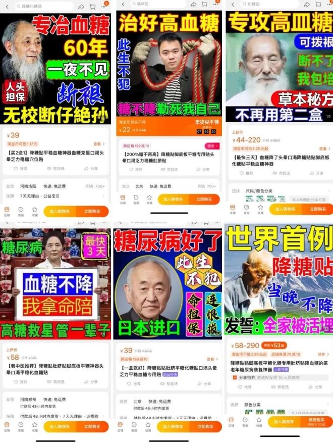 這類產(chǎn)品集中在治療高血糖領(lǐng)域,宣傳語是這樣的:“高糖救星,管一輩子”、“專冶(治)血糖,人頭擔保,無校(效)斷仔絕孫”、“治好高血糖,此生不犯,糖不降勒死我自己”、“世界首例降糖貼,當晚不降,全家被活埋”……毒誓發(fā)得一個比一個狠。