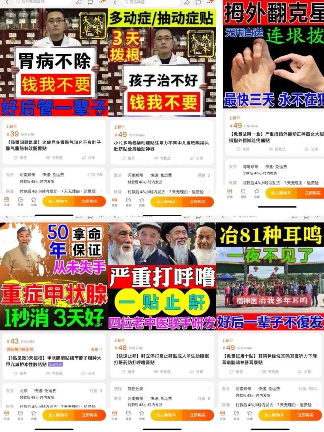 類似地,還有治療胃病、小兒多動癥、打鼾等的一系列膏藥貼,產(chǎn)品效果怎樣尚無定論,但廣告語都夸張離譜,并且有的獲得了不低的銷量,比如某平臺有店鋪顯示已成交就有5491件,商品評價也有1097條。