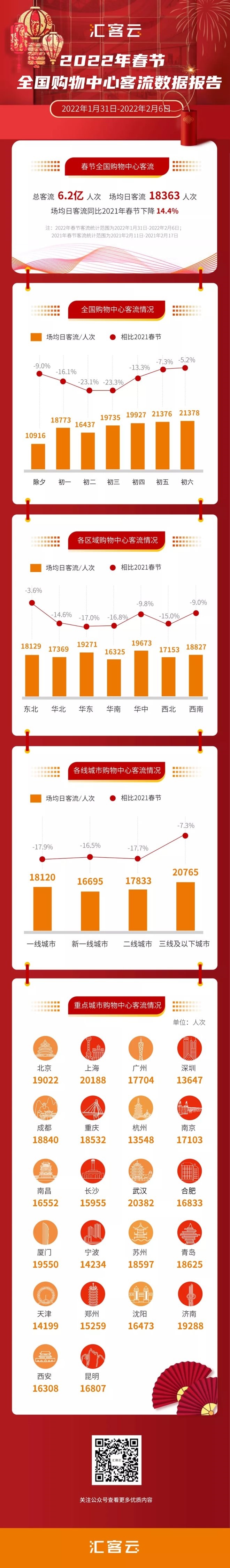 據(jù)匯納科技旗下匯客云數(shù)據(jù)平臺(tái)監(jiān)測(cè),2022年春節(jié)長(zhǎng)假期間(1月31日-2月6日),全國(guó)購(gòu)物中心總客流達(dá)6.2億人次;場(chǎng)均日客流18363人次,同比2021年春節(jié)下降14.4%。