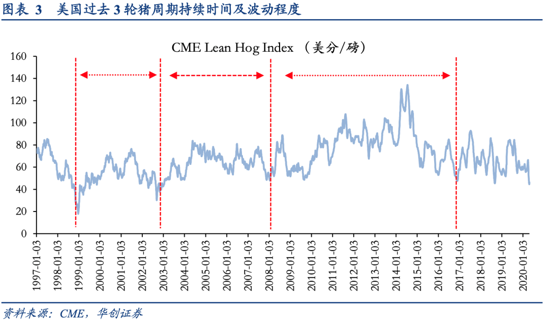 可以看到,養(yǎng)殖規(guī)模化程度的提升并未消滅豬周期,只是相對(duì)于中國的豬周期,這種波動(dòng)更頻繁,但周期幅度較窄,傷害性弱一些。