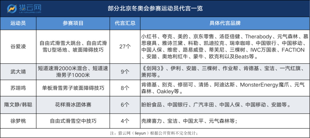 整體來看,品牌多從2021年開始提前押注冬奧會運動員,其中谷愛凌最受青睞,小紅書、元氣森林、京東零售、瑞幸咖啡等互聯(lián)網(wǎng)企業(yè)也開始參與其中。