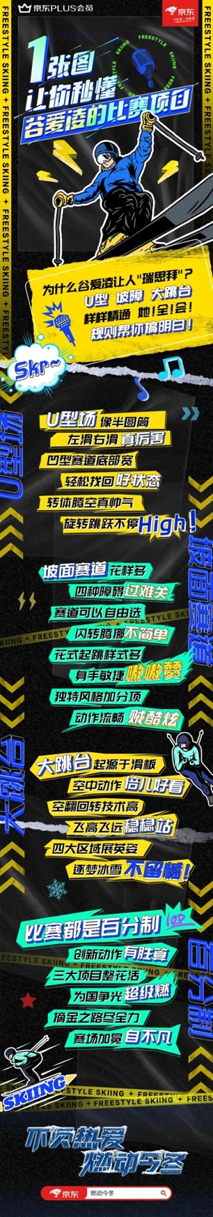 在冰雪健兒賽場奮戰(zhàn)的同時,京東也在賽場外積極進行冬季冰雪運動的科普,幫助大眾更加了解冬奧項目,從而得到更好的觀賽體驗,并更好地參與到冰雪運動之中。2月8日當天京東發(fā)布了谷愛凌參賽項目的科普海報,為大眾普及U型、坡障、大跳臺項目的相關基礎知識,幫助廣大冰雪愛好者無障礙觀賽。