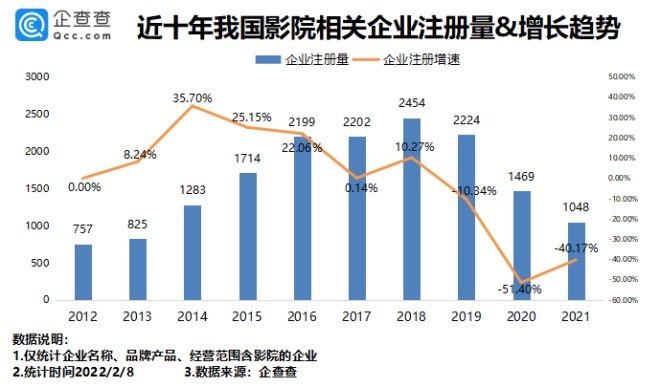 企查查數據顯示,我國共有影院相關企業(yè)2.49萬家,目前在業(yè)、存續(xù)的影院相關企業(yè)1.52萬家。2018年新增影院相關企業(yè)2454家,同比增長10.27%,是近十年新增最多的一年。2021年我國新增影院相關企業(yè)1048家,同比減少40.17%。