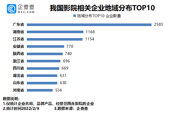 從區(qū)域分布來看,企查查數據顯示,廣東省以2583家影院相關企業(yè)排名第一。湖南、江蘇分別有影院相關企業(yè)1168家、1154家,排名前三。此后依次為安徽、陜西、浙江等省份。