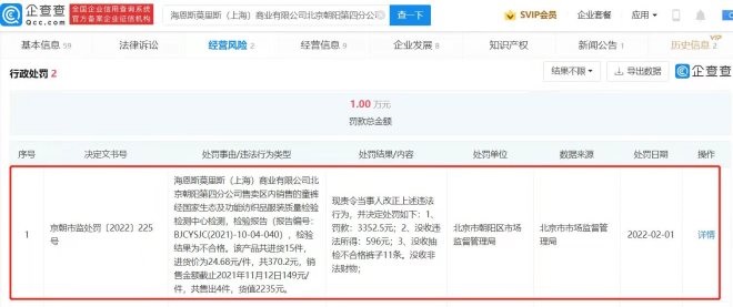 聯(lián)商快訊:根據(jù)企查查App顯示,近日,海恩斯莫里斯(上海)商業(yè)有限公司北京朝陽(yáng)第四分公司因銷(xiāo)售不合格童褲被罰款3352.5元,并沒(méi)收違法所得596元及不合格產(chǎn)品,處罰單位為北京市朝陽(yáng)區(qū)市場(chǎng)監(jiān)督管理局。