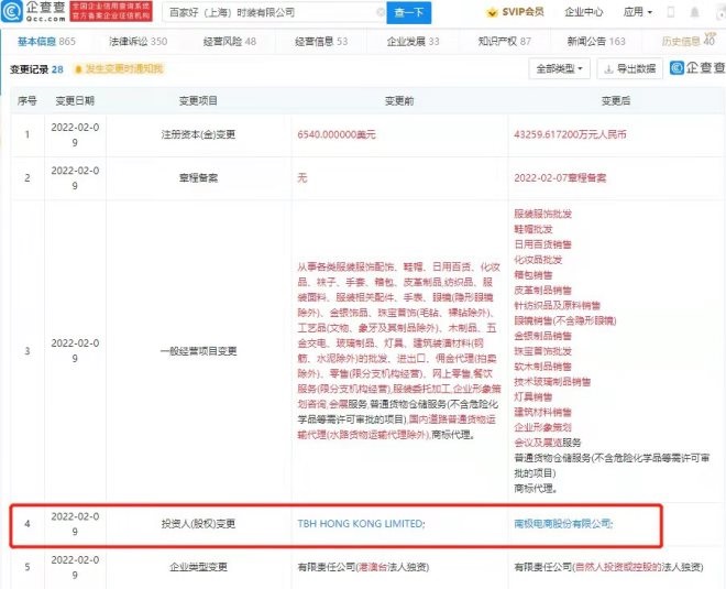 2月10日消息,企查查APP顯示,2月9日,百家好服飾關聯(lián)公司百家好(上海)時裝有限公司發(fā)生工商變更,原股東TBH HONG KONG LIMITED退出,新增股東南極電商,持股100%。