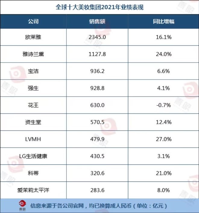 全球10大美妝集團業(yè)績大比拼,僅花王集團下跌