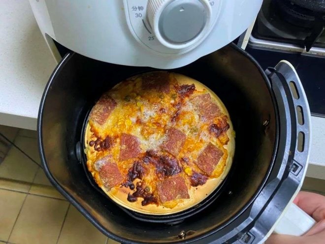 W購買了兩大盒預制披薩,按照說明在空氣炸鍋中180度烤制8分鐘,卻連著烤糊了兩張,“表面的青豆特別容易糊,但是餅底卻沒烤熟!彼缓孟劝雅_放在平底鍋里,先把餅底煎熟,再放進空氣炸鍋,用低溫小心翼翼地烘熟。