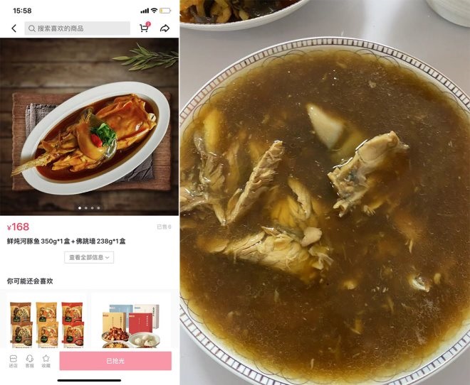 收到后,W把錫紙包加熱后倒進盤子里,眼前的景象讓她說不出話來。和直播間裝在精致磁盤里的完整河豚魚相比,眼前這盤甚至看不出是一條魚。
