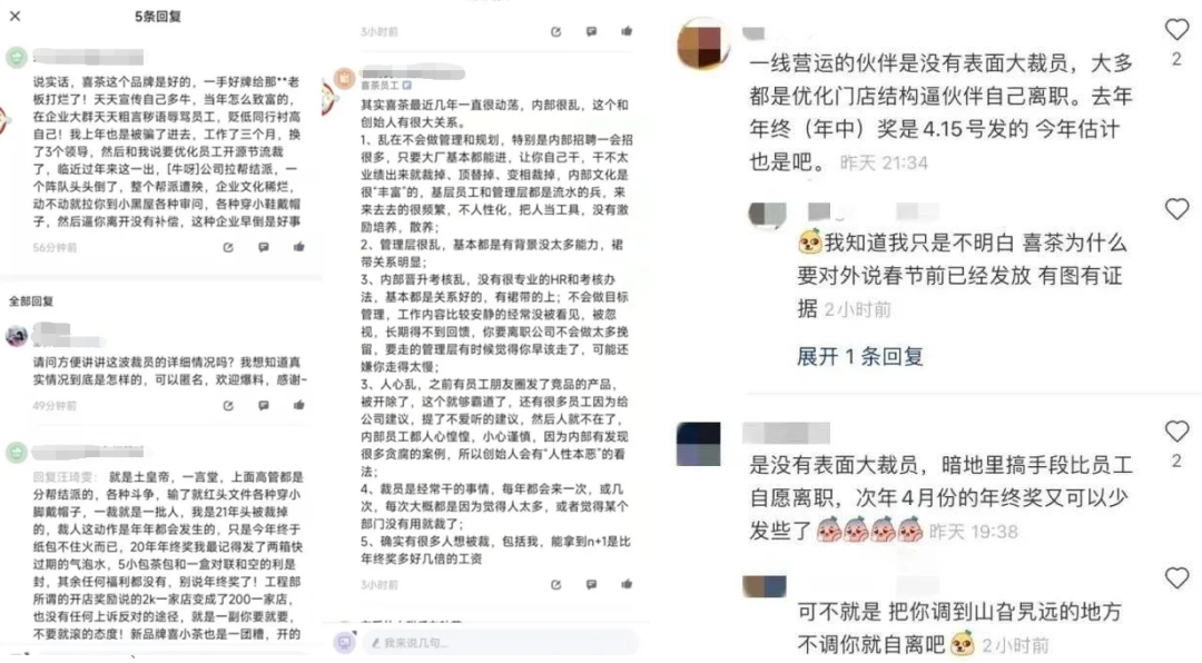 如脈脈上認證為喜茶員工的用戶稱,喜茶入職時的承諾與實際情況相去甚遠,業(yè)績差要通過大量裁員來節(jié)流!笆裁磻(zhàn)友文化,員工把后背交給你,你卻直接捅一刀”、“其實喜茶最近幾年一直很動蕩,內(nèi)部很亂。管理層很亂,裙帶關(guān)系明顯;裁員是經(jīng)常干的事,每年都會來一次;有很多人想被裁,能拿到n+1是比年終獎多好幾倍的工資!