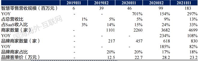 主要涉及的行業(yè)包括,時尚鞋服,商業(yè)地產(chǎn)、商超、便利、家居建材、數(shù)碼電器、美妝母嬰等行業(yè),由于國內(nèi)企業(yè)數(shù)字化水平較低,滲透率的提升和客戶數(shù)都有很大的提升空間。20年這部分全年收入1.45億,到21年上半年,收入已經(jīng)達(dá)到了1.83億。