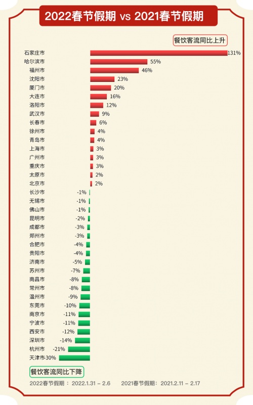 2022年春節(jié)假期,石家莊、哈爾濱餐飲客流分別大漲131%、55%,居全國(guó)首席,推測(cè)主要原因在于去年春節(jié)假期時(shí),這兩地疫情非常嚴(yán)重,導(dǎo)致去年的客流非常低。