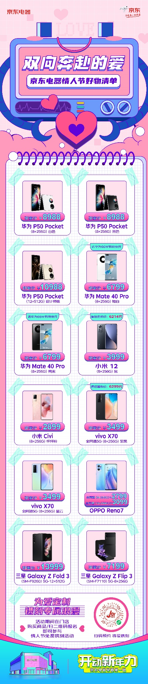 除了富有新意的體驗活動外,京東五星電器還透露,針對華為、蘋果、小米、三星、榮耀、OPPO、vivo等備受年輕人喜愛的新款產(chǎn)品,都將以情人節(jié)“好物清單價”來襲,如256G華為P50 Pocket甜蜜價8988元,256G華為Mate40 Pro勁爆價6799元,256G小米12活動價3999元,256G vivo X70優(yōu)惠價3499元,256G OPPO Reno7低至2799元……還在躊躇不知選哪款的消費者不妨到店尋求導購員的幫助吧!