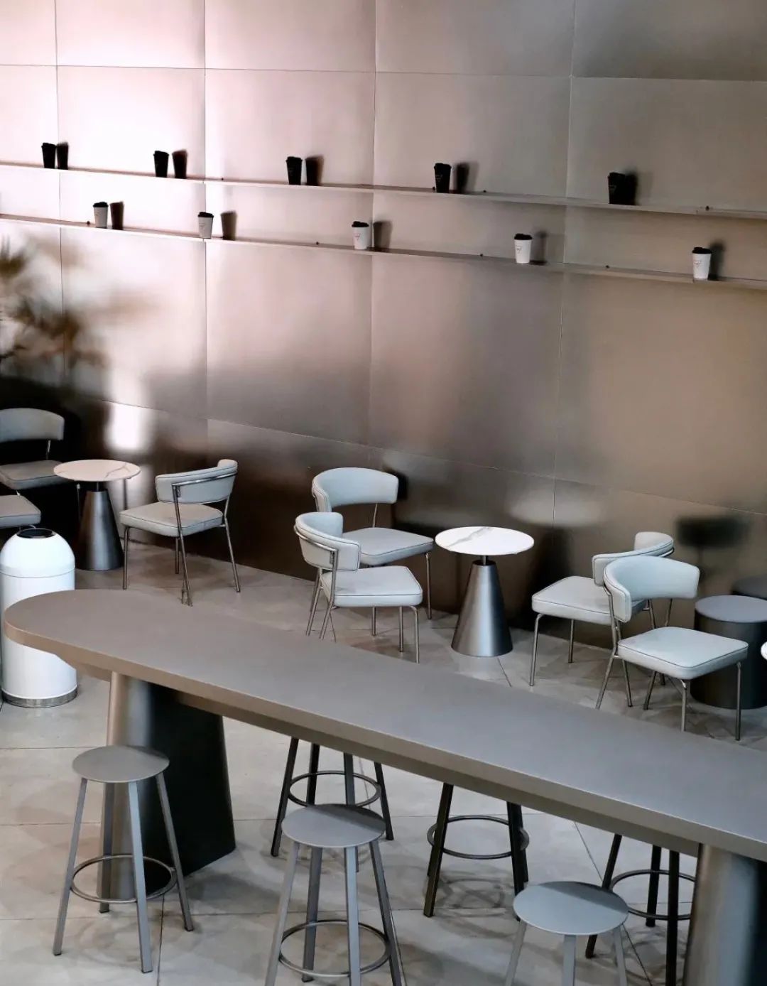 在浙江首店的店面裝修上,MANNER COFFEE大面積地運用了白色、銀色的顏色,在桌椅的選擇上也同樣青睞帶有白色元素的金屬制桌椅,店內(nèi)裝修風(fēng)格高度統(tǒng)一,白色和銀色又給人以干凈整潔的感受,整個店面透露著低調(diào)的高級感。