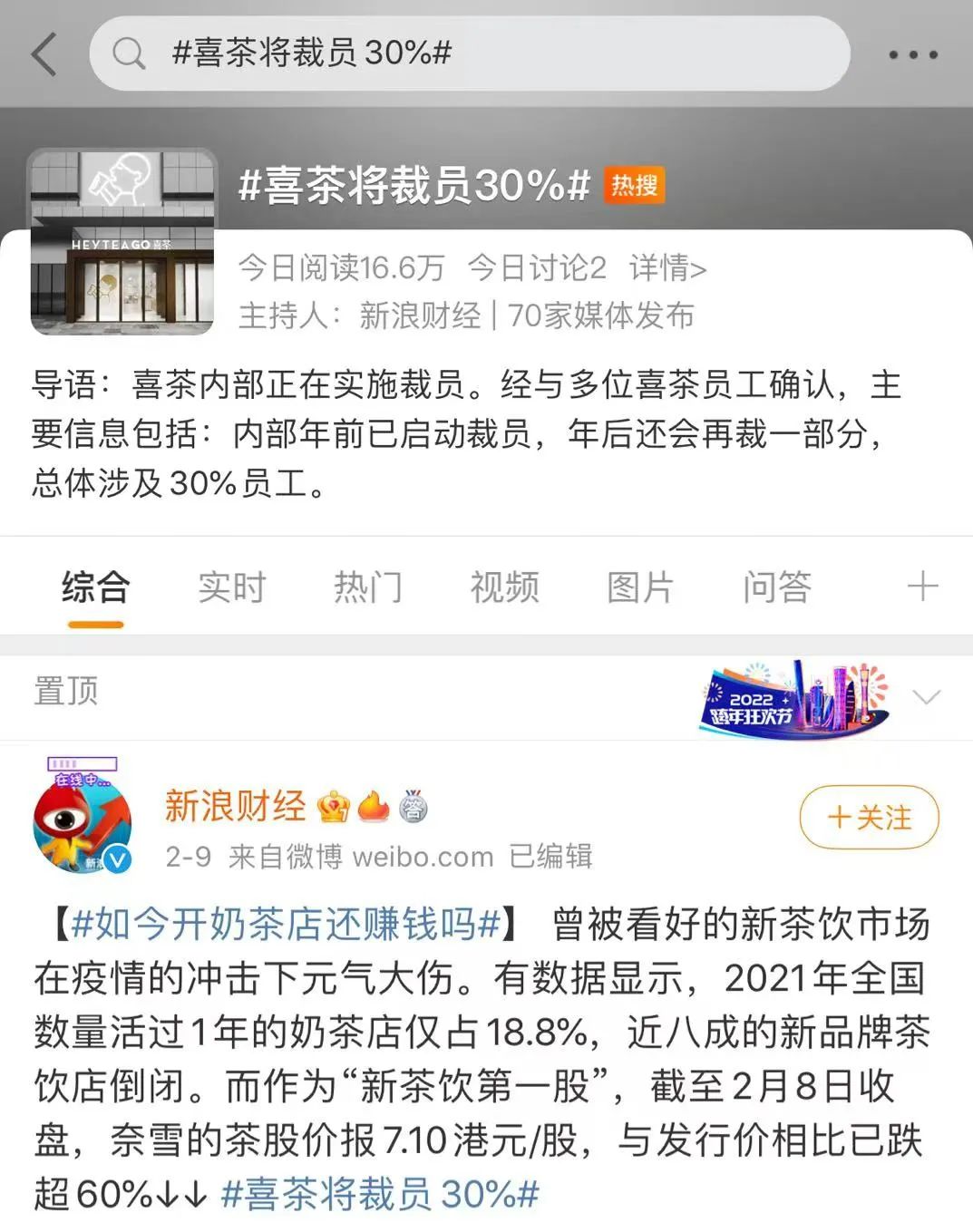 “喜茶裁員”上了熱搜 圖源:微博