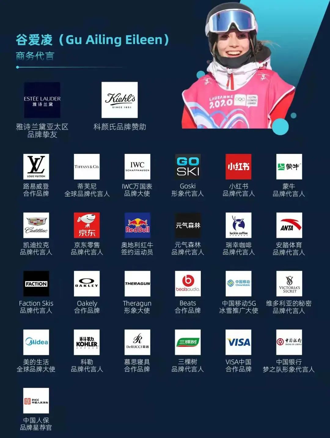 截至目前,據(jù)不完全統(tǒng)計,就已經(jīng)有將近30個品牌,與谷愛凌進行了商務(wù)合作,而且品牌種類也很豐富,我們先一起來盤點一下。