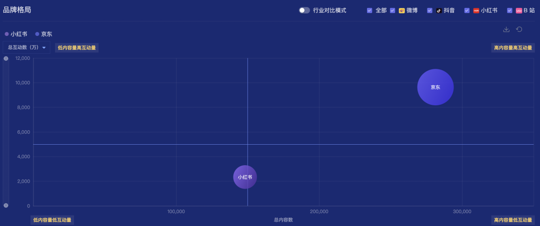 微觀層面,我們對比分析了同為泛互聯(lián)網(wǎng)平臺,同樣是谷愛凌代言的小紅書和京東,近30天綜合社交平臺的品牌格局,京東處于高內(nèi)容量高互動量象限,而小紅書的內(nèi)容量和互動量則都略有遜色。當然這個對比只是社交熱度的一個側(cè)面反應(yīng),具體與品牌不同的營銷策略和投入也有相當關(guān)系。