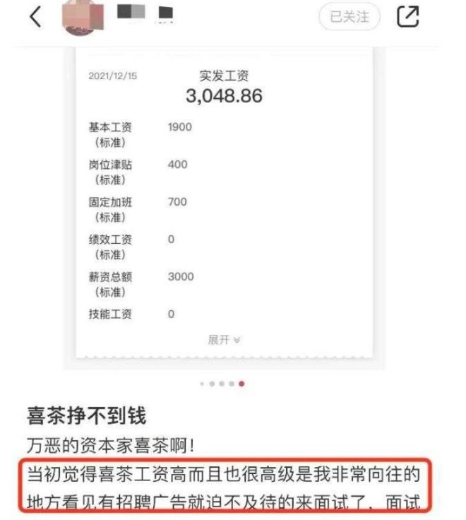 上述小紅書博主也表示,自己2021年6月份入職喜茶,三個(gè)月實(shí)習(xí)期滿轉(zhuǎn)正之后,就沒拿過一次完整的工資!捌渲惺潞褪辉率怯捎谝咔樵驔]法上班,十二月份本來應(yīng)該發(fā)全勤,到手應(yīng)該有3700-4000元,但最后只發(fā)了3000元。”