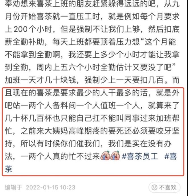 除了收入減少外,她提到,喜茶從9月份開始一直在壓工時(shí)!袄缑總(gè)月要求上夠200個(gè)小時(shí),但是強(qiáng)制不讓員工上夠,月底扣薪全勤補(bǔ)助等。”