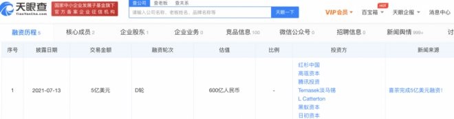 2021年熱度仍在持續(xù),天眼查APP顯示,喜茶去年7月融資5億美元,估值達600億人民幣。