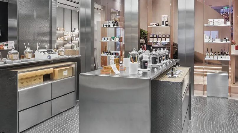 從門店特點來看,新銳品牌的線下直營店,大多更強調(diào)品類特點和品牌調(diào)性的展現(xiàn)。比如香氛、彩妝品牌突出“體驗感”和“沉浸式場景”的打造,護(hù)膚品牌則著重強調(diào)“功效”、“檢測”等概念。