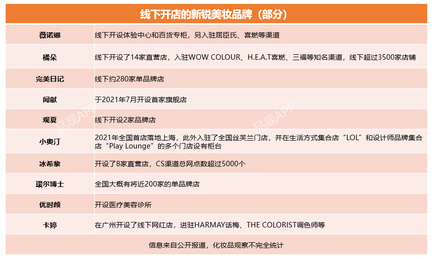 僅在2021年下半年,就有觀夏、聞獻(xiàn)、薇諾娜、小奧汀、橘朵等品牌,在線下開設(shè)直營店,而選擇入駐美妝集合店的新銳品牌則多不勝數(shù)。