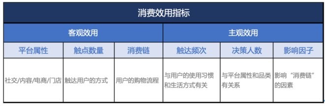 這里的消費效用主要分為客觀效用和主觀效用,我將這兩個效用進行了進一步的拆解,細分為六個指標(biāo),包括平臺屬性、觸點數(shù)量、消費鏈、觸達頻次、決策人數(shù)和影響因子。