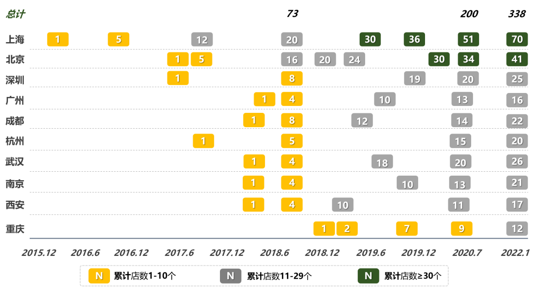圖7:盒馬核心業(yè)態(tài)的擴(kuò)張進(jìn)程,大店&mini店,2016.01-2022.01
