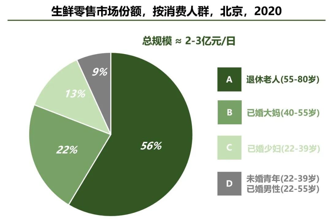 在展開(kāi)之前,先用幾個(gè)數(shù)據(jù)看下整個(gè)生鮮零售和盒馬業(yè)態(tài)的人群畫(huà)像(圖4-圖6)。圖4把所有生鮮電商模式按核心年齡段、配送時(shí)效、價(jià)格定位、線上單量規(guī)模等指標(biāo)放一起比較,盒馬在切青年人群(18-39歲)上一騎絕塵,而社區(qū)團(tuán)購(gòu)主打的低價(jià)平質(zhì)生鮮切中了高頻買(mǎi)菜人群(30-60歲)。高頻買(mǎi)菜人群是個(gè)不可忽視的群體,圖5是北京地區(qū)的情況,中老年人占近8成,且越往低線城市,中老年占比會(huì)更高,他們既是家庭日常買(mǎi)菜和日用品的核心決策者,也是傳統(tǒng)大賣(mài)場(chǎng)的高復(fù)購(gòu)人群,但弊端在于,此群體對(duì)日百、煙酒、母嬰、休食、消費(fèi)電子等的需求不斷被拼多多瓜分,最終離賣(mài)場(chǎng)的最佳品類(lèi)貢獻(xiàn)結(jié)構(gòu)越走越遠(yuǎn)。
