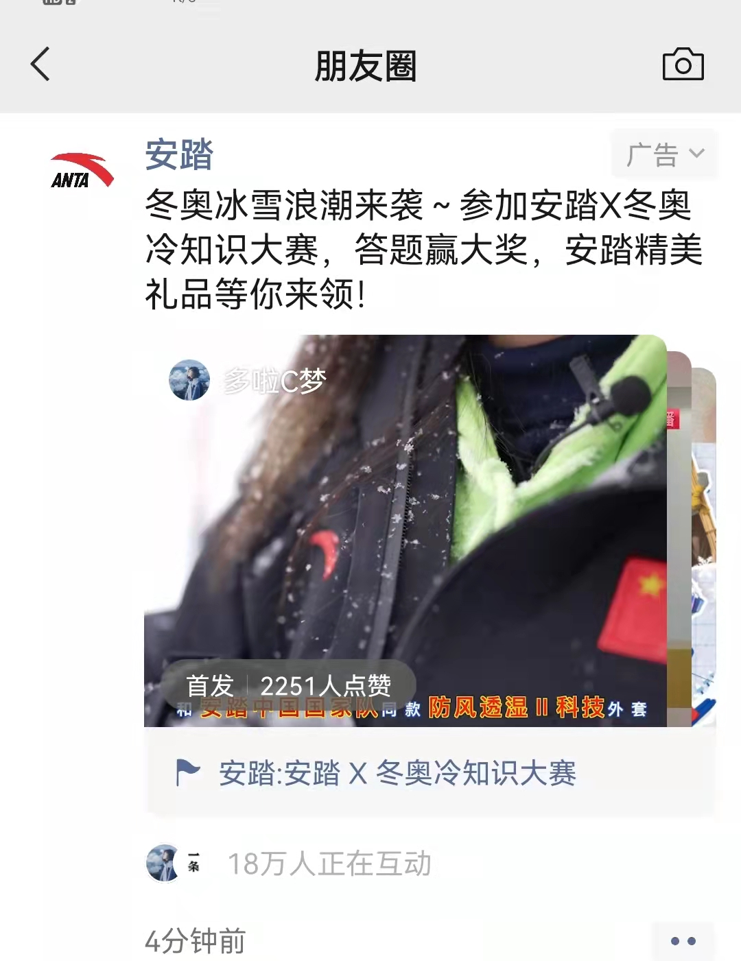 新晉頂流谷愛凌在獲得自由式滑雪女子大跳臺項(xiàng)目金牌后,穿著安踏羽絨服登上領(lǐng)獎(jiǎng)臺,微博話題#谷愛凌這羽絨服顯瘦#引發(fā)網(wǎng)友廣泛討論。安踏也趁熱打鐵,在谷愛凌奪冠后第一時(shí)間生成海報(bào),并進(jìn)行微信朋友圈廣告投放,進(jìn)一步擴(kuò)大品牌影響力。
