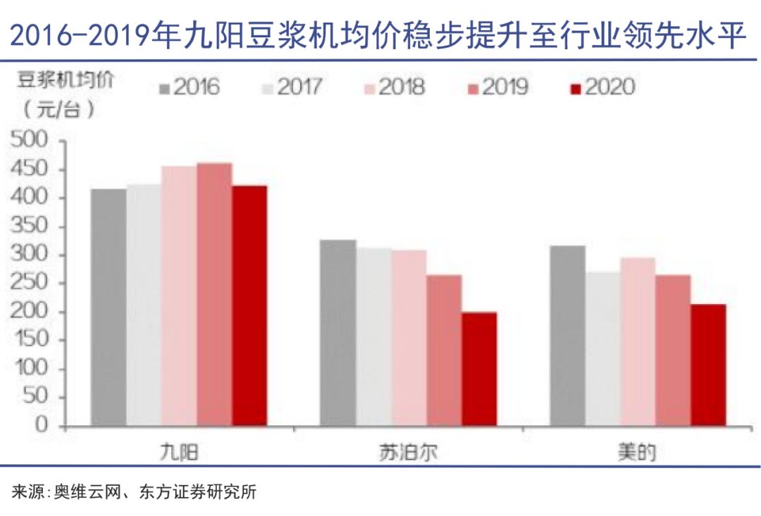 東方證券研究所報告顯示,九陽旗下的“SKY系列”,通過豐富其在不同價位段的布局,豆?jié){機(jī)均價穩(wěn)步提升至行業(yè)領(lǐng)先水平,并能夠保持市占率居于行業(yè)前列。