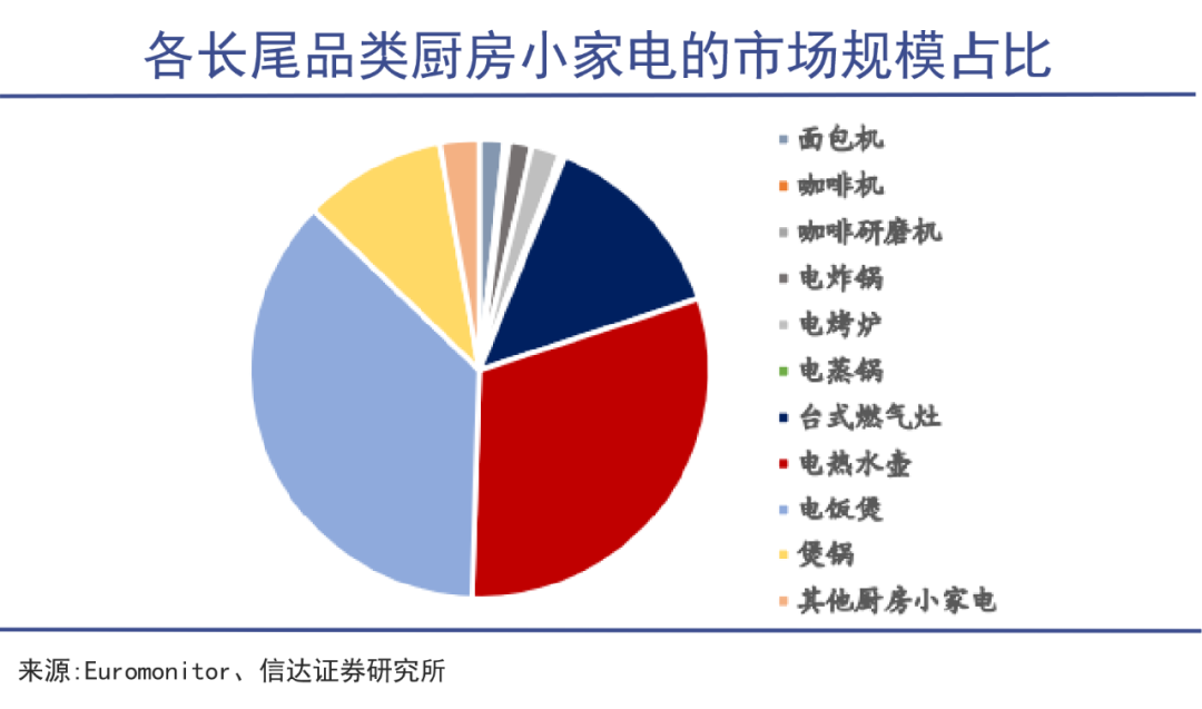 信達(dá)證券研究院調(diào)查顯示,以面包機(jī)、咖啡機(jī)為代表的長尾品類小家電市場在我國小家電市場規(guī)模中占據(jù)相當(dāng)比例,且長尾品類增速快于傳統(tǒng)品類。