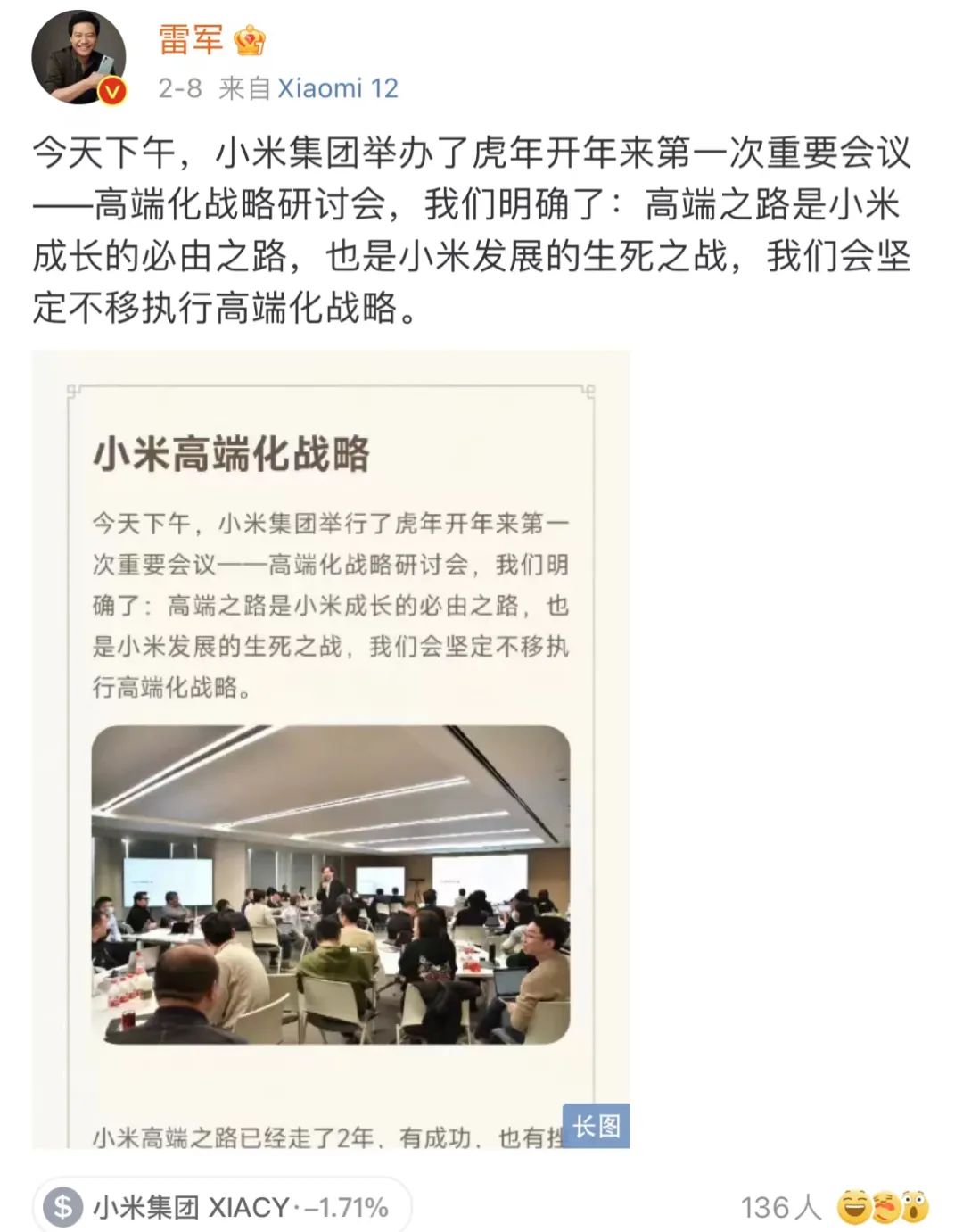 虎年開工第二天的2月8日,雷軍在微博發(fā)文稱,小米集團(tuán)成功舉辦虎年首場(chǎng)重要會(huì)議——高端化戰(zhàn)略研討會(huì)。