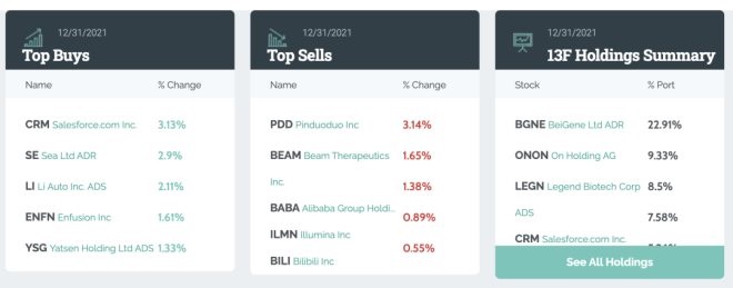 HHLR Advisors 最新的前十大重倉(cāng)股為百濟(jì)神州、On 昂跑、傳奇生物、Salesforce、天境生物、京東、SEA、DoorDash、愛(ài)奇藝和理想汽車。