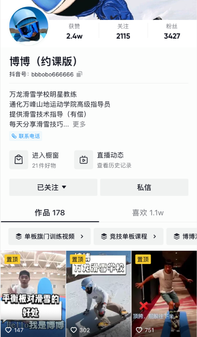 喜歡滑雪的年輕人越來越多,在他們喜歡的平臺(tái)上開賬號(hào),不但可以展示自己,還可以給潛在的學(xué)員展示自己的實(shí)力,減少了前期磨合的成本,獲得更多生源。