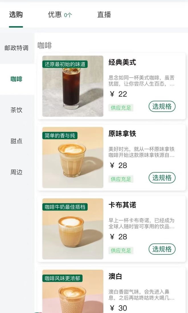 目前郵局咖啡微信小程序已上線,有門店自取和門店快送兩種線上點單服務(wù)。