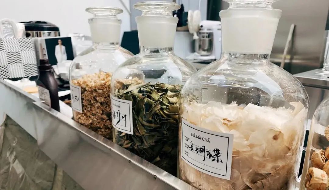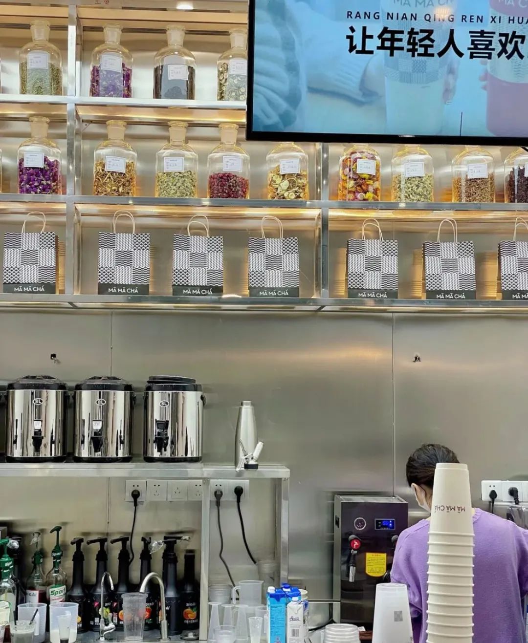 MAMACHA的吧臺架子上還擺滿著各種茶葉,該品牌的一大特點就是所有產(chǎn)品均選取海拔2500米的云南無量山茶葉,嚴格的選品奠定了MAMACHA人氣的火爆局面。